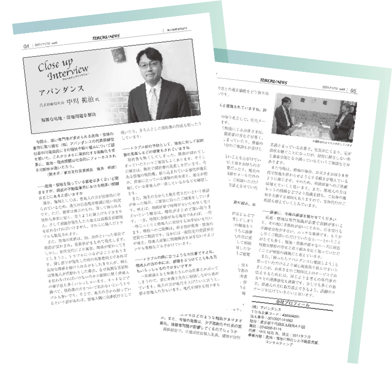 アバンダンスとは、底地(貸宅地)・借地の現金化や有効活用等で、たくさんの税理士・司法書士・弁護士の先生方にご利用頂いている、底地・借地専門の不動産会社です。